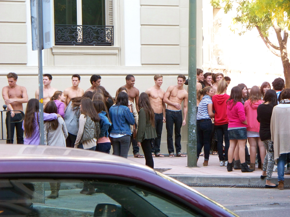 Abercrombie & Fitch models stopping traffic in downtown Madrid.